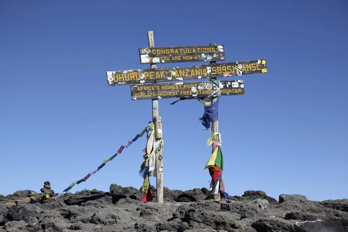 Around midnight, you will be woken up and served a snack before starting the final section of your ascent to the summit – in pitch darkness. Most people consider the difficult terrain you have to traverse on the 6-hour hike to Stella Point the biggest challenge of the entire trip. The aim is to reach Stella Point shortly after sunrise so that you can admire the sight of the blood-red sun rising gently above the horizon. You are not given long to rest, however, because otherwise it would be almost impossible to shake off the cold and fatigue and continue along the rim of the crater to Uhuru. The last stretch of the climb features an even incline. Depending on the season, you may encounter snow on the last part of the route to Uhuru Peak, which is your final goal: the top of Kilimanjaro and the highest point in Africa. Once you reach the peak at an altitude of 5,895 masl, you can give yourself a pat on the back, enjoy the magnificent view and have your picture taken in front of the Uhuru Peak sign as a lasting souvenir of your achievement.