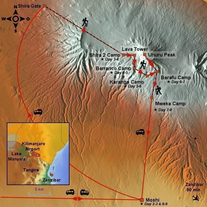 Heights: Moshi: 915 AMSL., Shira Gate: 3,600 AMSL., Shira 2 Camp: 3,840 AMSL.