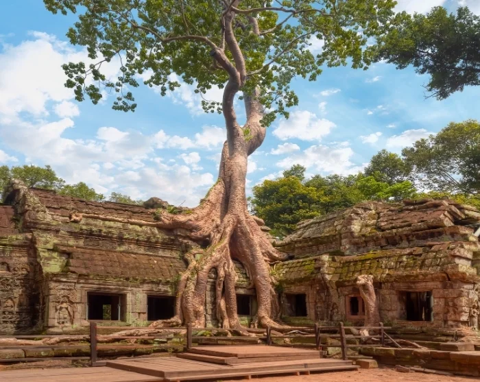 After a short drive, you’ll arrive at Ta Prohm, a temple that stands apart from the rest. Here, massive trees have taken root among the ruins, creating a mesmerising fusion of nature and ancient stone.