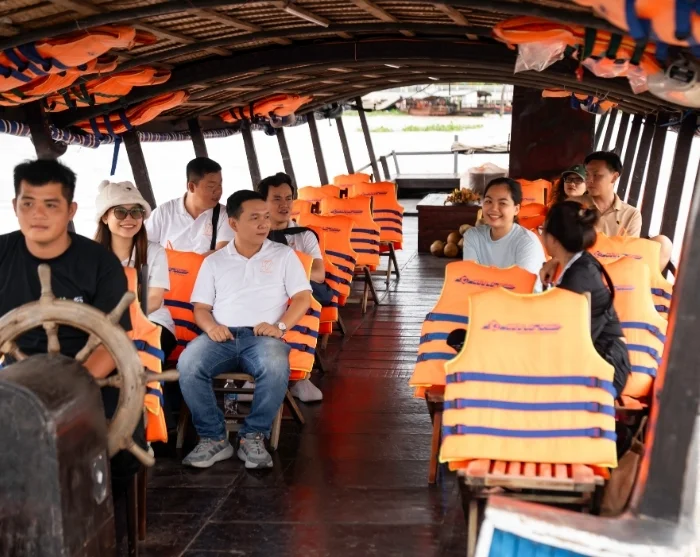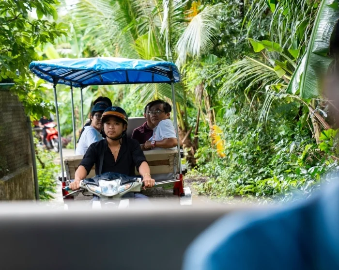 Your boat journey will continue to a tranquil island in the heart of the Mekong River, where you’ll enjoy a Vietnamese lunch prepared from fresh, local ingredients, surrounded by lush greenery and the peaceful rhythm of river life.