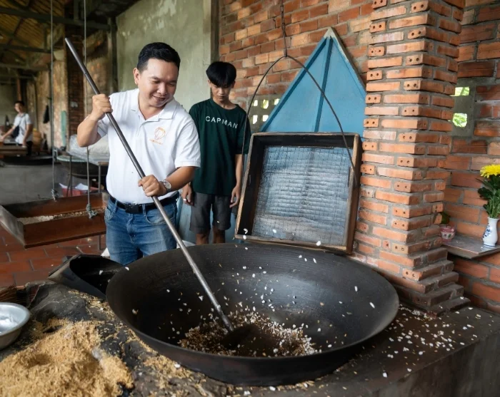 Your tuk tuk then meanders through the quiet lanes of the village. Your first stop is at a local family’s home where you’ll sample com dep (green rice flakes) and see how popped rice is made.