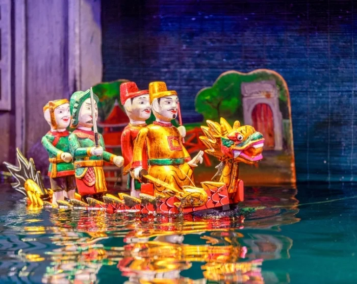 The day’s sightseeing tour concludes with a performance at a water puppet theatre, an age-old Vietnamese tradition where intricately carved puppets dance across the water’s surface, accompanied by live music and classic storytelling.