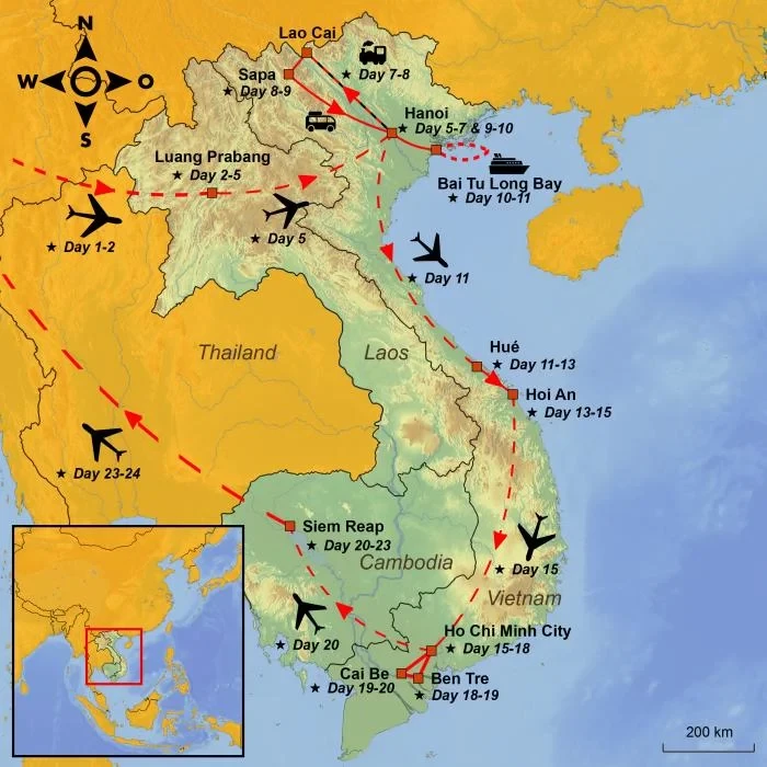 This tour will take you through the very best of Indochina, allowing you to experience three fascinating countries, each with its own distinct atmosphere, breathtaking landscapes, and rich cultural heritage.