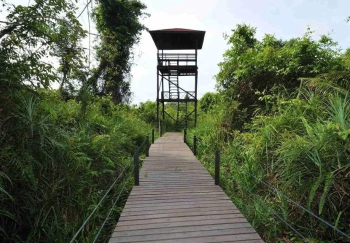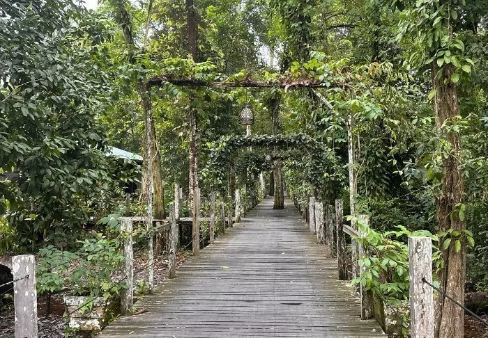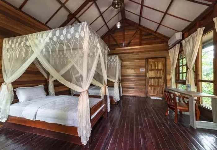 The lodge’s 30 bungalows are all built on stilts and linked by an elevated boardwalk system, blending seamlessly into the breathtaking natural setting. Each bungalow is equipped with a ceiling fan and a private bathroom featuring a shower, hot water, and eco-friendly toiletries. From your own private veranda, immerse yourself in the sounds of the rainforest as you watch out for langurs, which often wander by.
