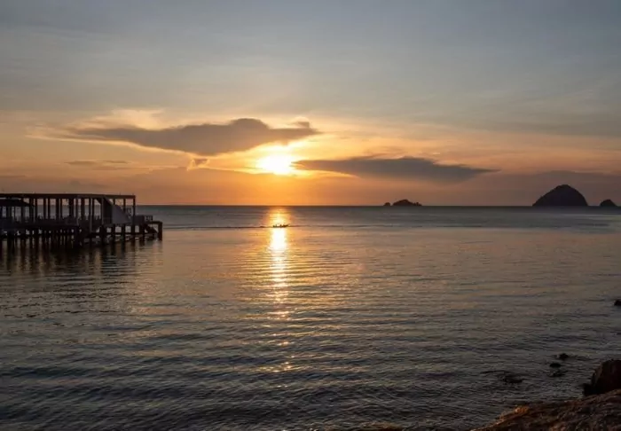 As the sun sets, Cenang Beach transforms into an atmospheric oasis with fire shows and beach bars, where you can relax on bean bags and enjoy Langkawi’s iconic sunset, painting the sky in shades of orange, red, and purple as the sea glistens in the twilight glow.