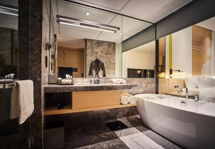 The Waterfront Hotel offers 208 stylish rooms designed for your ultimate comfort. Each room is elegantly furnished with modern amenities such as air conditioning, a TV, a minibar, tea and coffee making facilities, free Wi-Fi, and spacious bathrooms equipped with luxurious toiletries, bathrobes, and slippers.