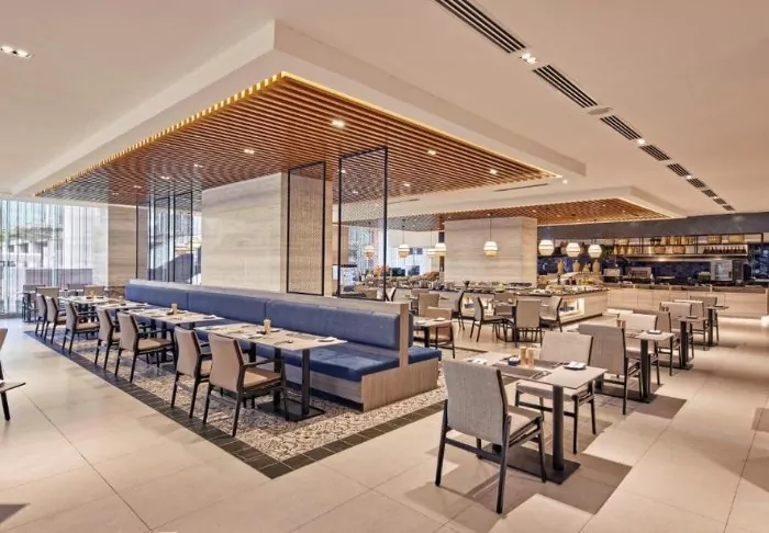 The hotel’s spacious rooms are stylishly decorated, featuring large windows that allow plenty of natural daylight in, while offering stunning views of the city’s skyline. The unique architectural design ensures that noise and heat are kept at bay. The rooms are meticulously designed in cool earthy tones and are equipped with modern amenities such as air conditioning, Wi-Fi, a flat-screen TV, a safety box, a minibar with snacks and beverages, and a spacious bathroom with a rain shower, bathtub, and toiletries.
