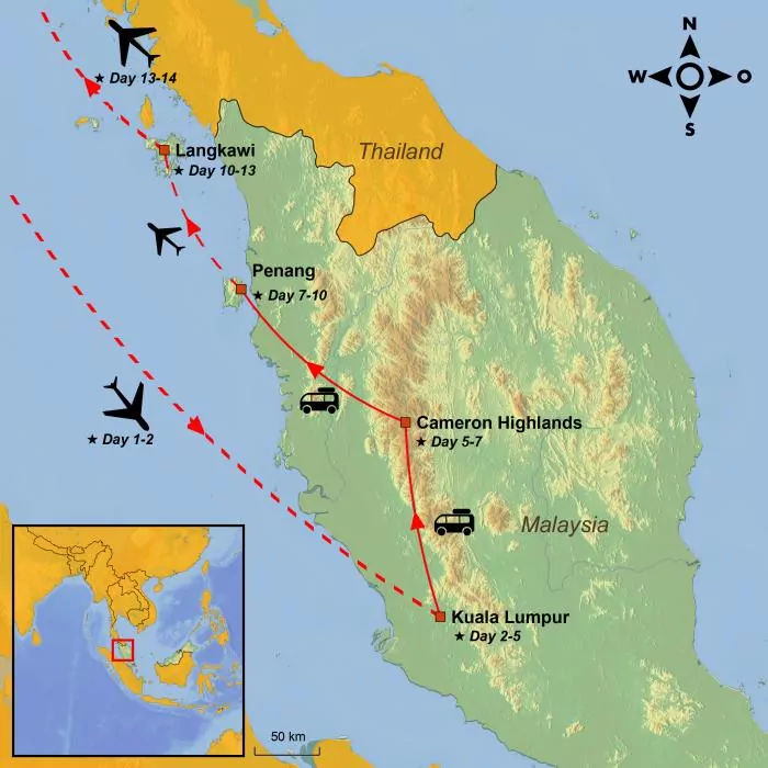 This tour showcases Malaysia’s absolute highlights: from the bustling heart of Kuala Lumpur and the serene Cameron Highlands to the cultural tapestry of George Town and the inviting sandy beaches of Langkawi.