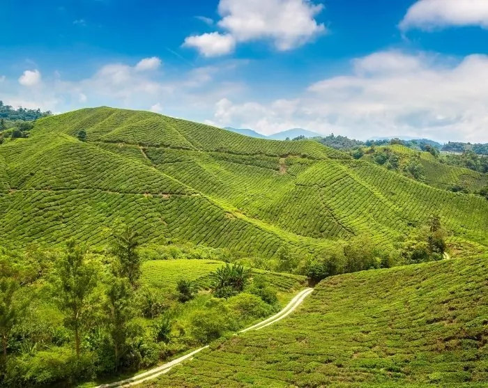 The Cameron Highlands are located 1,542 metres above sea level and offer a cooler climate compared to the rest of Malaysia. The pleasant temperatures make the land particularly fertile, which is used for cultivating strawberries, corn, orchids, roses, and tea with plantations stretching as far as the eye can see.