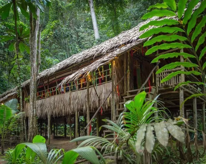 For your stay in the rainforest, you won’t need to pack too much. Opt for a lightweight backpack or a smaller bag and leave your suitcase behind at your hotel. From there, you’ll be picked up and driven roughly 5 hours towards Batang Ai National Park, with a stop on the way at Lachau Bazaar, where you can wander among small shops and a quaint local market. Enjoy an early lunch in one of the cosy local coffee shops before continuing on to Batang Ai Lake. Here, you’ll board a traditional longboat, which will carry you away from civilisation to the riverside home of the Iban tribe, where even phone signals yield to the unspoiled nature. The boat ride takes about 1.5 hours.