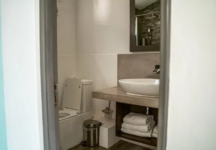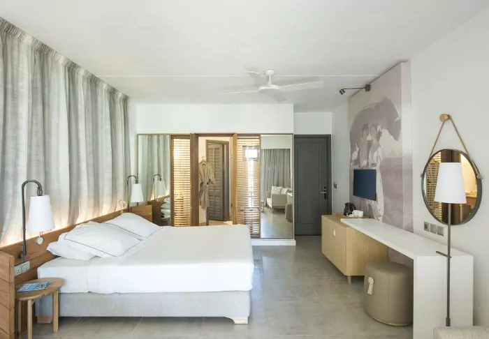 The hotel consists entirely of large deluxe rooms, which all have either a balcony or terrace and are sea facing. All rooms have either a large double bed (king size) or twin beds. Other room amenities include air conditioning, telephone with voice mail, safe, minibar, TV with multiple channels and tea or coffee making facilities.