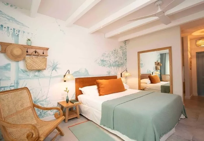 The hotel has 116 rooms, all of which have en suite bathrooms, air conditioning, tea/coffee-making facilities, minibars and free Wi-Fi. The rooms are very charming, with colours used to good effect so they are both inviting, modern and retro at the same time. All the rooms have a private balcony or terrace. Each room is also equipped with a ‘beach set’ comprising a basket with towels and beach mats, and even your own cooler bag.