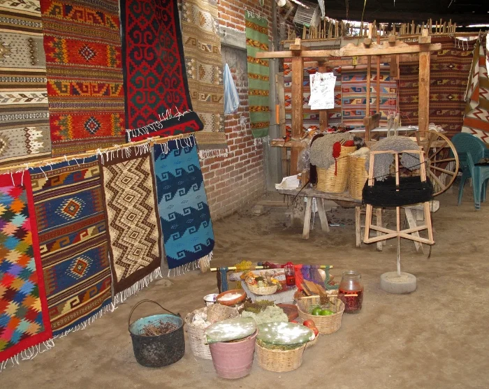 The tour continues to Teotitlan, known for its beautiful, hand-woven wool rugs. Here, you can witness the traditional weaving technique passed down through generations.