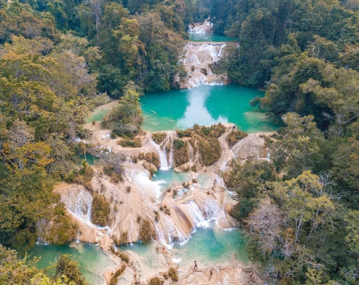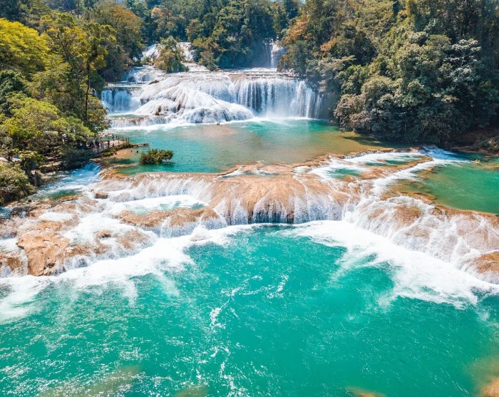 The first stop is at the Agua Azul waterfalls (the blue waterfalls), where turquoise water cascades over white limestone tiers in multiple levels. This vivid water colour is due to the high mineral and limestone content reflecting the sunlight, creating an almost magical setting. These waterfalls are encircled by rainforest, with small natural pools formed along the river’s course where you can bathe and relish the refreshing waters.