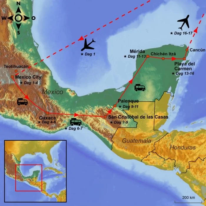 Discover Mexico’s colourful diversity on a tour that weaves together culture, history, natural wonders, and relaxation. Your journey begins in Mexico City, where the vibrant pace of city life meets colonial heritage and ancient Aztec ruins. From here, you’ll continue to the enchanting city of Oaxaca, renowned for its rich cuisine, lively markets, and the impressive archaeological site of Monte Albán. High up in the mountains, San Cristóbal de las Casas awaits, inviting you to wander its cosy streets and browse the bustling local markets. The adventure continues through the scenic landscapes of Chiapas, with stops at stunning waterfalls and the legendary Palenque ruins, tucked deep in the jungle. In Mérida – the cultural heart of Yucatán – you’ll explore elegant architecture and sample regional gastronomy. Round off your journey with pure relaxation beneath the palm trees on Playa del Carmen’s white sandy beaches and the dazzling turquoise sea.
