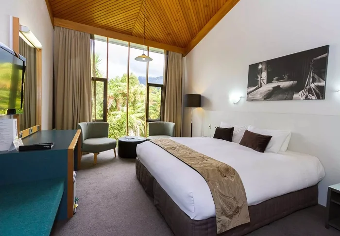 The hotel boasts 227 rooms and suites, all tastefully decorated in a cosy style and offering views of either Lake Rotorua or the lush, green gardens. Every room provides free Wi-Fi, a flat-screen LCD TV, a safety box, and tea and coffee making facilities—perfect for winding down with a cuppa in the comfort of your room.