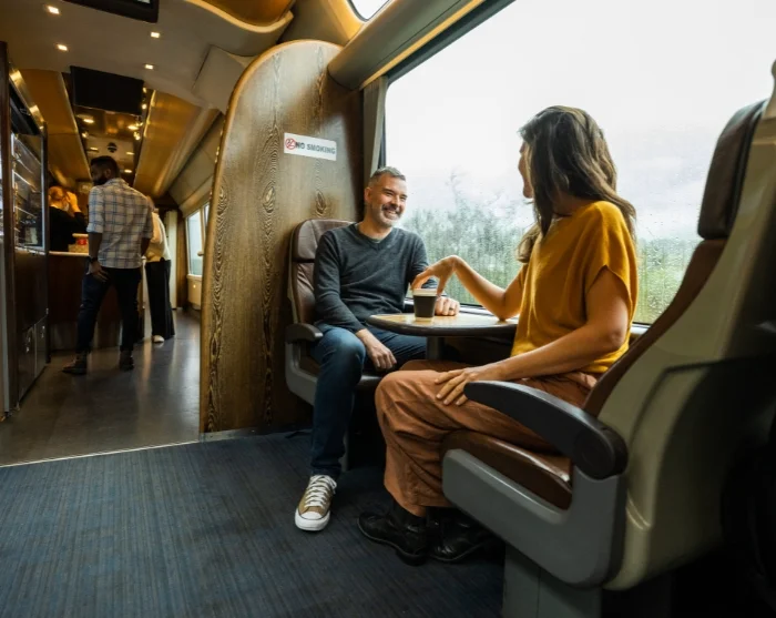 The train features an open-air viewing carriage, where you can stand outside, breathe in the fresh air, enjoy the views, and capture stunning photographs. Be sure to bring warm clothing if you plan to spend time here. There’s also a café on board where you can purchase food and drinks.