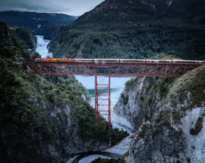 Keep your camera ready as the train traverses the spectacular Staircase Viaduct, which raises the tracks 73 metres above Staircase Creek, a tributary of the Waimakariri River. Like the Otira Tunnel, this viaduct stands as another marvel of engineering.