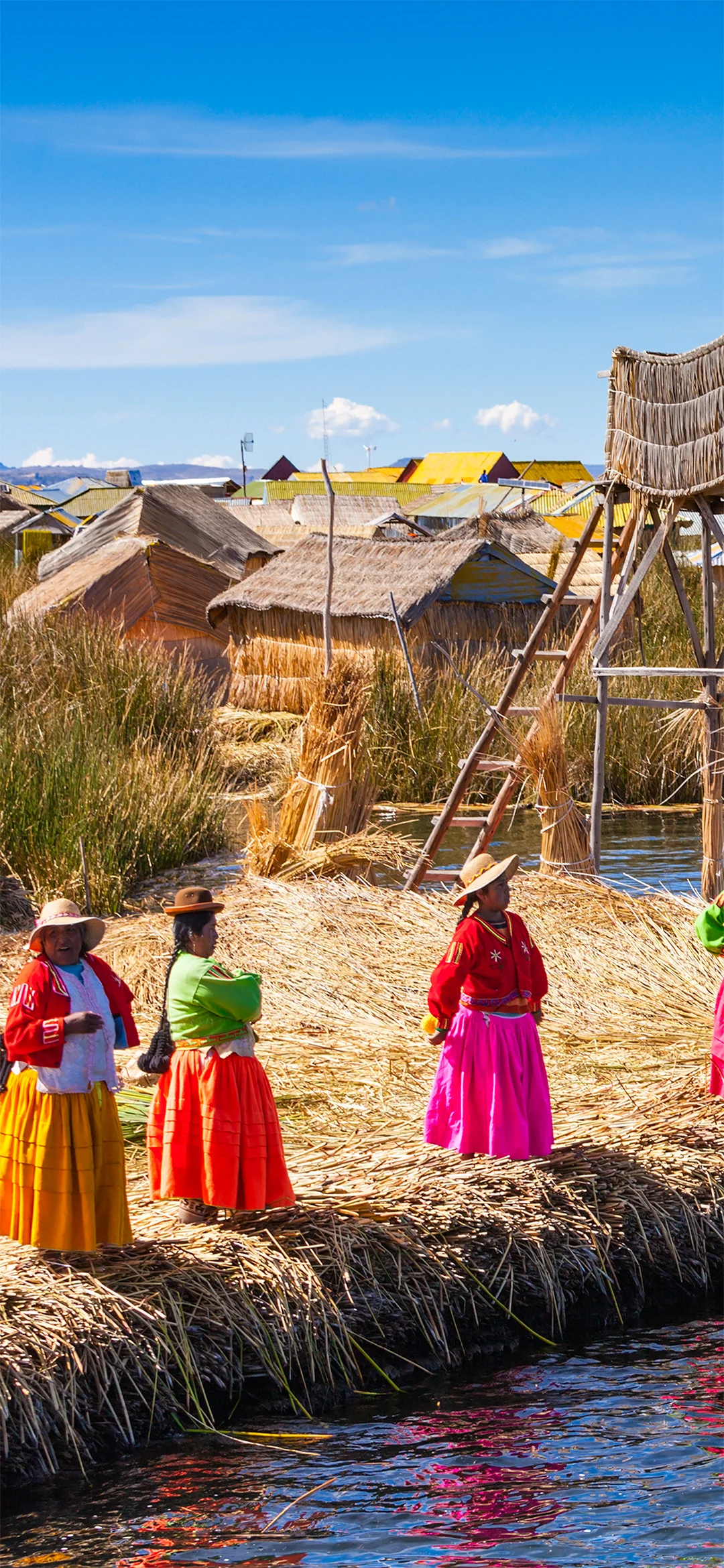Today, you’ll enjoy a full-day excursion on Lake Titicaca, which stretches between Peru and Bolivia. Here, an exciting encounter awaits with two very different highland communities, where ancient traditions are still proudly upheld.