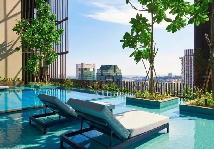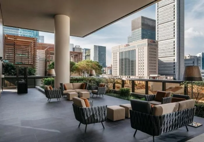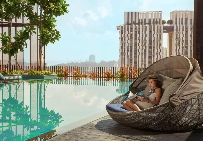 And it’s not only from the outside that you’ll note its spectacular way of embracing nature in the middle of the big city. On the 27th floor, you’ll find the roof terrace, adorned with 21 different types of creepers and vines, where you have every opportunity to relax on a sun lounger next to one of the two pools. A few floors further down, you’ll find another terrace, which looks like a lush oasis. Bring a good book with you and sit yourself down in their lounge area or dig out your gym wear and work out on the green lawned area while enjoying the fantastic view. You can also make use of their gym, which is open around the clock.