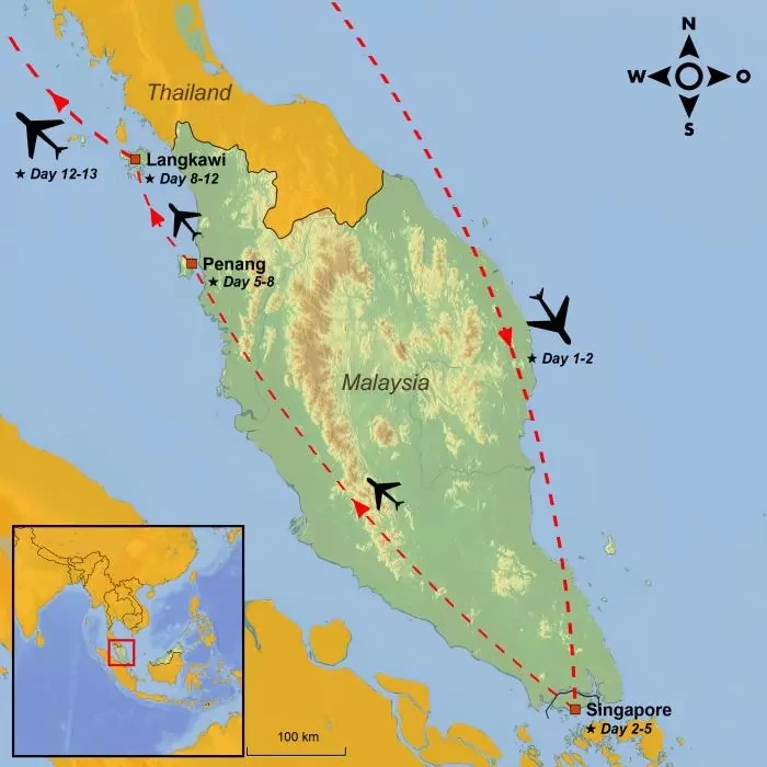 The tour concludes on the island of Langkawi, where soft sandy beaches invite relaxation and delightful natural experiences – perfect for absorbing the adventures and impressions of your journey.
