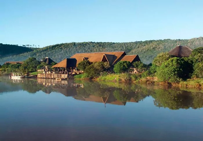 The 4-star River Lodge is located in the Kariega Game Reserve on the banks of – and almost extending into – Bushman’s River. The way that the restaurant, bar and swimming pool have been constructed almost makes you feel that you are surrounded by the still, reflective water of the river. The lodge has a unique viewing terrace built out over the river. This is the perfect place to sip a drink at sunset, or to enjoy dinner under a starry sky. Privacy is the defining feature of the lodge and its suites, making this the ideal place to enjoy some peace and quiet. The lodge comprises of ten exclusive, luxury suites with thatched roofs, laid out at intervals along the river bank. The suites are very spacious and decorated with examples of African art and crafts. Each suite has its own viewing terrace, air conditioning, ceiling fan, internet, safe and telephone, as well as a well-appointed bathroom with a bathtub.