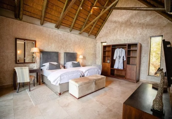 The camp is located in a private section within the Kruger National Park itself, and from the pool, you have an excellent view facing the National Park. You can often see a bloat of hippopotamuses in the river just beyond the big grassy field, and there are benches (and a fence!) set up for you to comfortably and peacefully sit and listen to them puff and frolic in the water below.