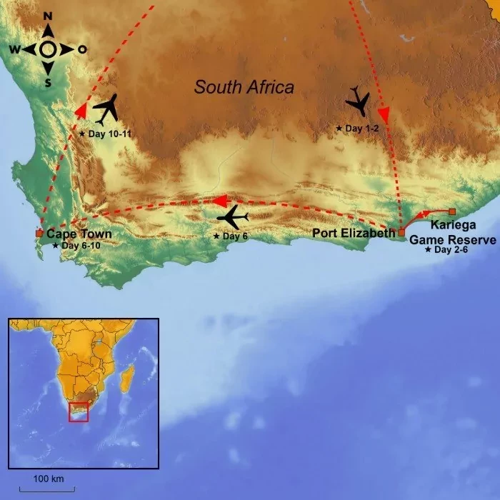 Forget about malaria pills on the Eastern Cape and enjoy an “all inclusive” safari experience, bushwalk and visit to a local village. End your tour with a city break in beautiful Cape Town.