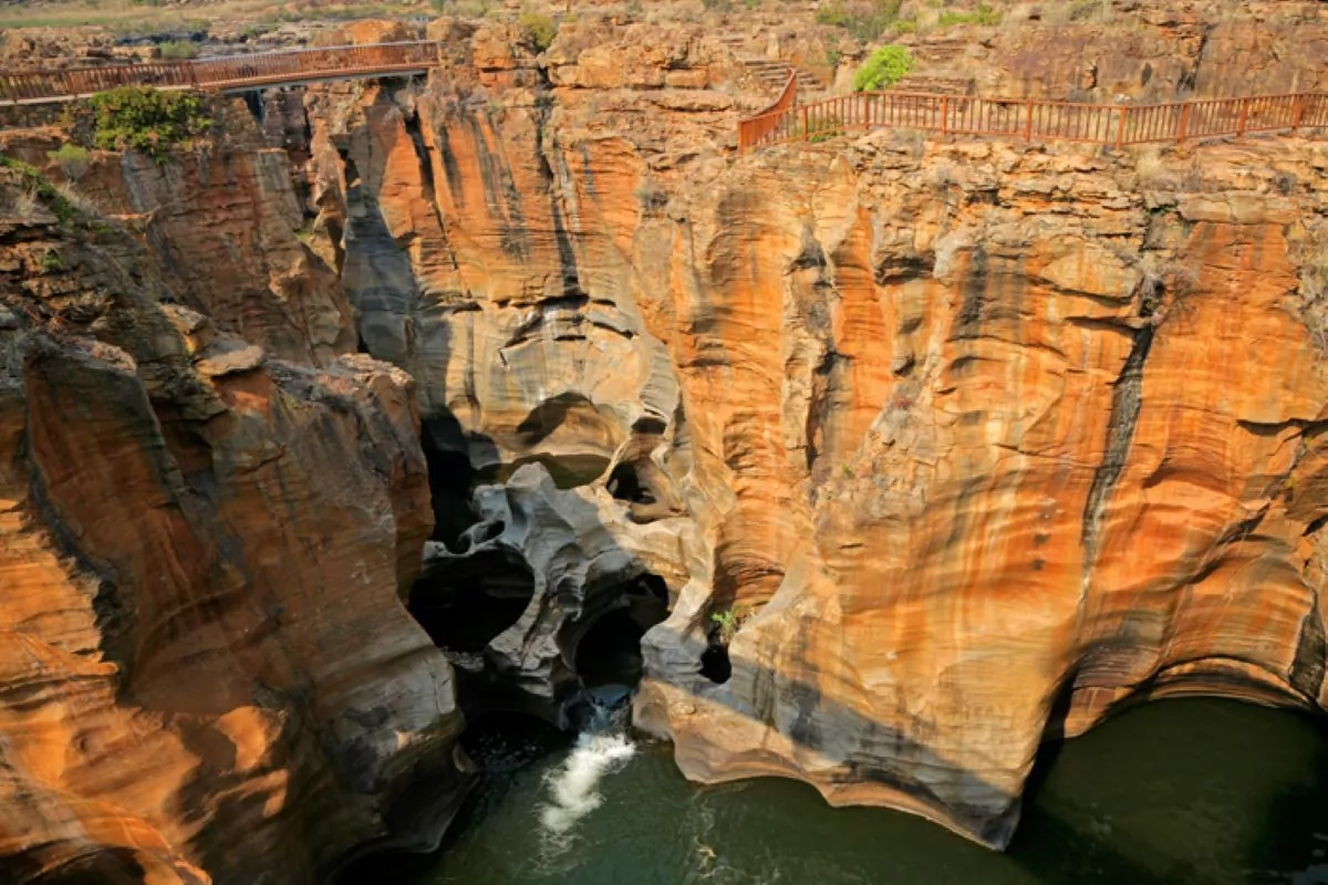 Today is given over to a beautifully scenic full-day trip along the Panorama Route through the dramatic Drakensberg Mountains. The mountains themselves are red, and form a magnificent contrast to the green trees and plants. On the trip, you will experience the breath-taking Blyde River Canyon. Measuring 700 m deep and 60 km long, it is the third-largest canyon in the world. You will stop at the three best vantage points along the canyon: God’s Window, Bourke’s Luck Potholes and The Three Rondavels – three beautiful and remarkable rock formations whose shape calls to mind the round huts previously to be found in local villages in many parts of southern Africa. The Panorama Route will also take you past a number of waterfalls, and you will have the chance to stop to admire one of them. This could, for example, be the Berlin Falls, where the water cascades down into a lake from a height of 150 metres. Or you may stop at the Lisbon Falls, located where the Blyde river splits in two and then drops 92 metres down an almost vertical cliff, before coming together to form a single river once more. There are many other waterfalls, however, and your guide will decide where you stop. One of the most spectacular sights you will see during the day is sure to be the Bourke’s Luck Potholes – cylindrical holes carved into the rocks by the action of water and sand over thousands of years. You can see this amazing natural phenomenon right up close from bridges built over the peculiar holes.