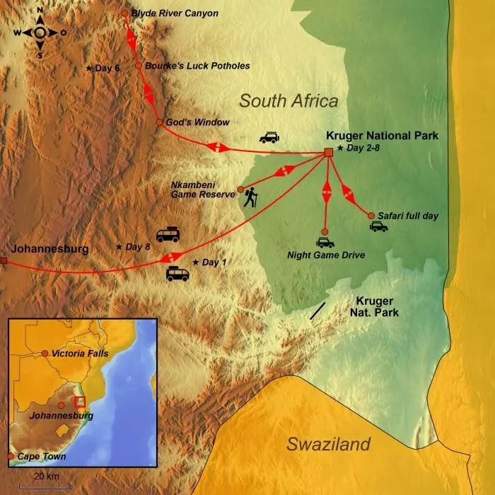 On this trip, you will be taken on exciting safaris in Kruger National Park, where you have every chance to experience ‘The Big 5’ right up close. In addition, you can learn how to decode the signs and signals of nature on a fascinating bush walk with a skilled ranger.