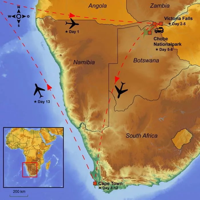 This tour combines three of the absolute highlights of southern Africa: the mighty Victoria Falls on the border between Zambia and Zimbabwe, a safari in Botswana’s amazing Chobe National Park and vibrant, scenic Cape Town in South Africa. Water, safari and city break in one and the same holiday.