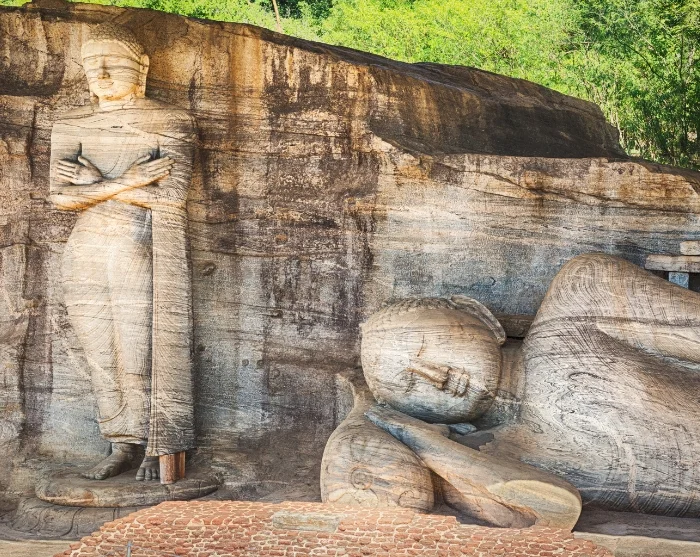 Next, travel to Buduruwagala Temple, dating back to the 10th century and famed for its well-preserved rock carvings. The temple features a grand rock face with a 16-metre high Buddha statue surrounded by six smaller figures, depicting Buddha in various poses of meditation. Here, you can appreciate their intricate detail and serene expression in peace, as Buduruwagala enjoys a quieter existence compared to other temples you’ve visited.