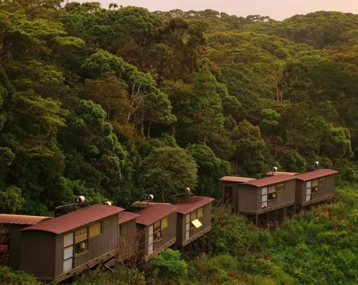 The lodge consists of 20 cabins dotted throughout the green tea plantation. All are built using recycled materials. The cabins themselves are built from old shipping containers, the walls and ceilings are built from bamboo and the terraces are built from railway sleepers.
