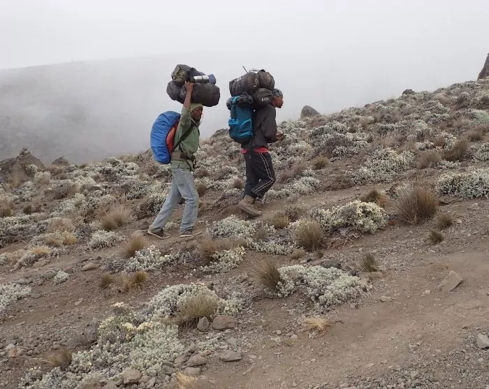 Through Tanzanian legislation, porters on Kilimanjaro are assured a minimum wage, and MKPS membership ensures that the individual porters receive more than the minimum wage. Through MKPS, all porters also receive three meals daily, proper clothing for the mountain (jackets, boots, gloves, etc.), tents, sleeping bags, mattress, etc. In addition, rules have been put in place as to how much each porter may actually carry, and all porters have health insurance. They are also given a course in first aid, English courses and guidance on setting up a bank account, etc. The porters at MKPS, in turn, undertake to help pick up rubbish on the route to the top of Kilimanjaro twice a year. MKPS is 100% Tanzanian.
