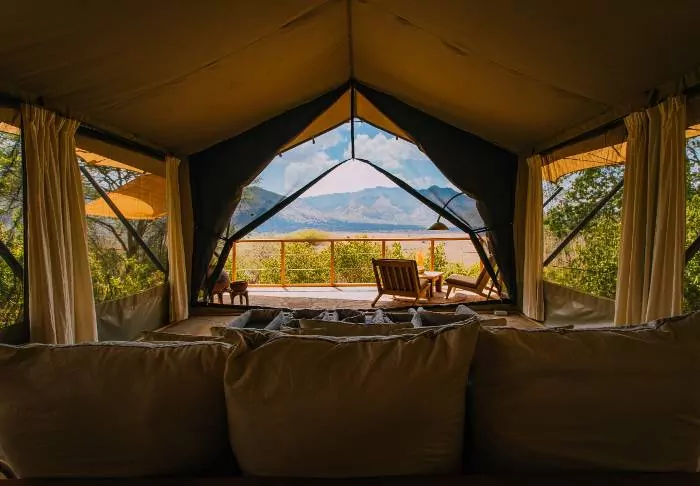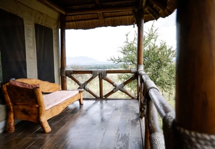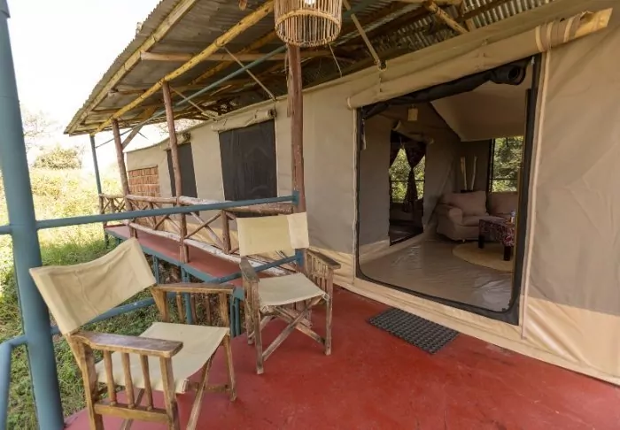 Ngorongoro Wild Camp consists of 20 large, full-height tents with a solid floor. The tents are built on poles, giving them most amazing views of the area from the terrace in front of the tent itself. All tents have their own large, tiled bathroom with running water, a toilet and a shower.