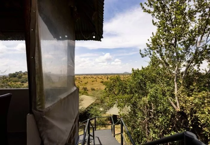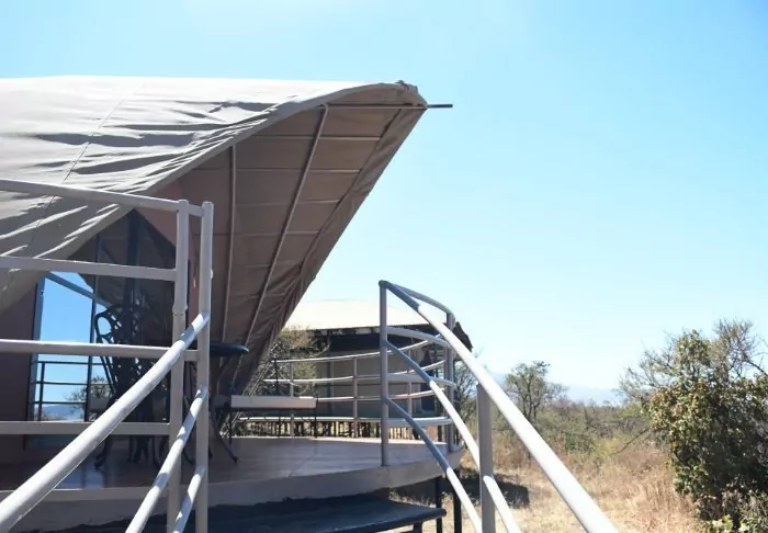 The tent camp consists of seven luxury tents, all of which are located on their own platform with a balcony, from which you have the most beautiful view of the Dindira plain below you. The tents are large and spacious and extremely well furnished. They have a private bathroom – which is, however, best suited for couples travelling together – and really comfortable beds.