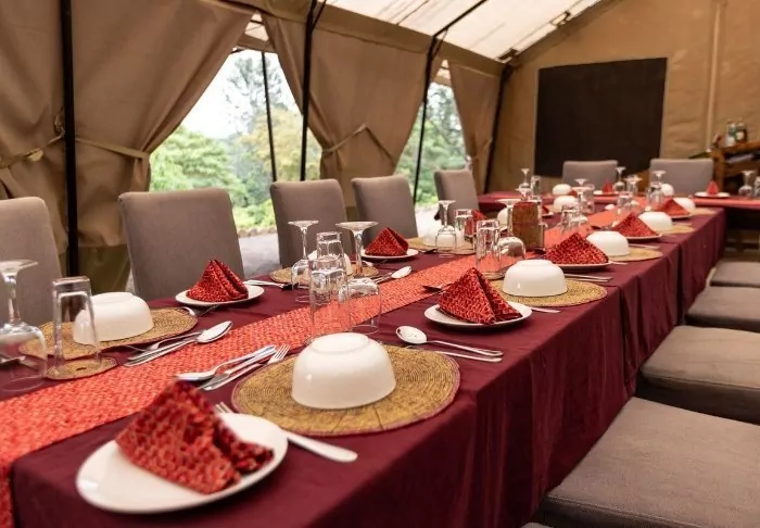 The rooms at the Coffee Lodge are slightly secluded, around 100 metres from the hotel itself. The lodge consists of 4 double houses with two rooms in each house. They lie staggered up a hill, so there is air and space around them. They all have a large bathroom, a private veranda and plenty of space to relax with a book. The rooms have their own dining tent, where you can choose to eat breakfast and/or dinner while enjoying the view of the valley and the coffee plantations.