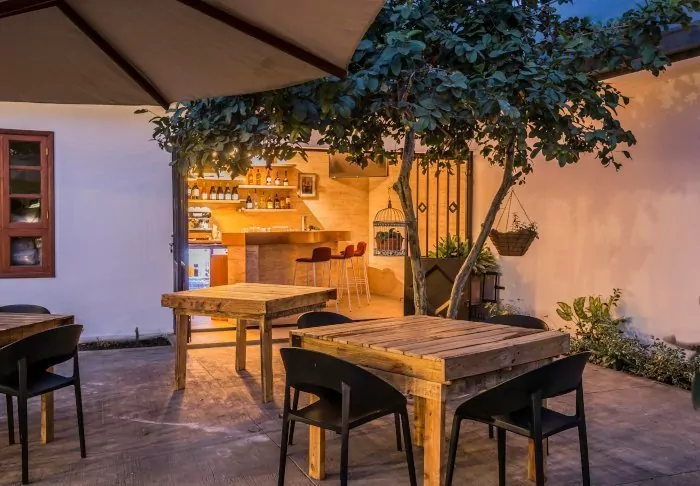 The cosy living room is made for an afternoon with a good book, and the covered terrace is the perfect place to sit with a cup of coffee and enjoy the excellent Wi-Fi. The small garden offers a pool with sun loungers, and in one “wing” of the house, you’ll find the well-stocked bar.