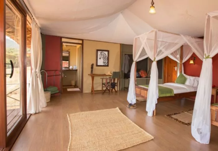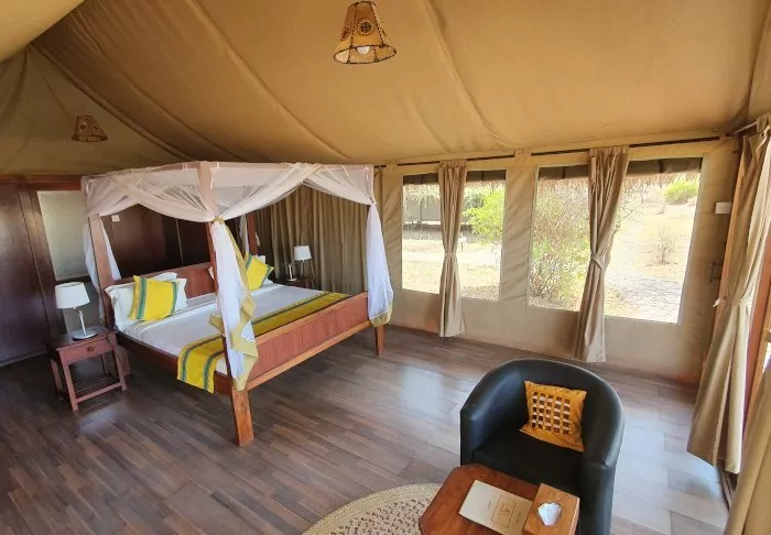 The camp is a classic African safari camp with rustic, comfortable canvas tents. The nature and wildlife are right on your doorstep. It is not uncommon for wild animals to pass through the camp at night, and you can expect to see gazelles, antelopes, zebras, and occasionally elephants and hyenas, around the camp.