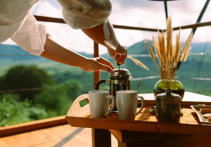 In the morning, you are served freshly made coffee on the balcony, so you can take your time to enjoy the sunrise before heading to the restaurant, where a rich breakfast is served.