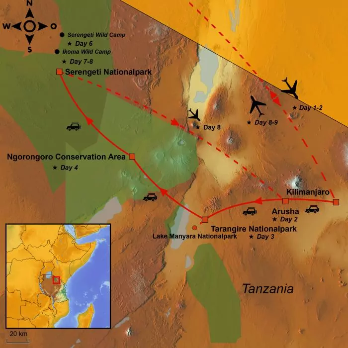It is time to say goodbye to Serengeti and Tanzania. You are driven to central Serengeti, from where you fly towards Arusha. Here you are met by a guide and driven to Kilimanjaro International Airport, from where your journey home begins.