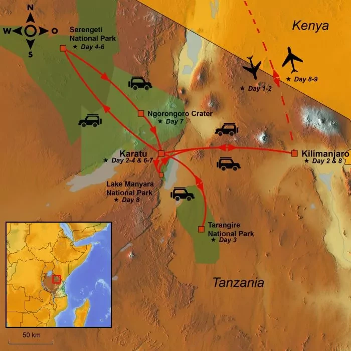 | Day 8 | Lake Manyara and to Kilimanjaro Airport is approximately | 195 |