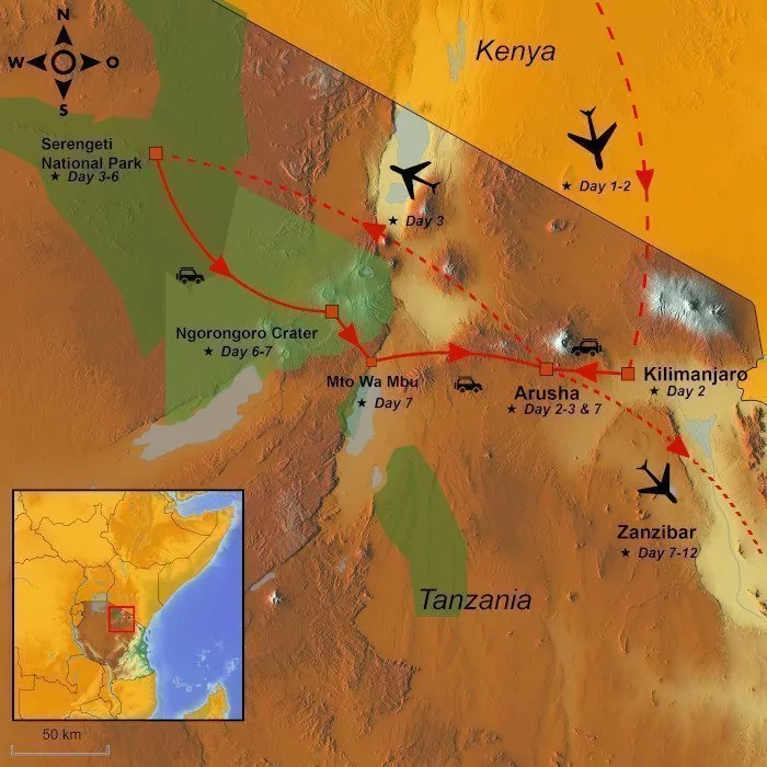 You become acquainted with the local culture on a visit to the village of Mto Wa Mbu, before Zanzibar entices you with its beautiful, white sandy beaches, turquoise sea and the option of excursions.