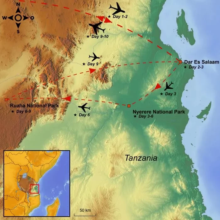 There is time for a last morning game drive before breakfast at the lodge and departure towards the airstrip. From here, you say goodbye to the bush and fly back to Dar Es Salaam.