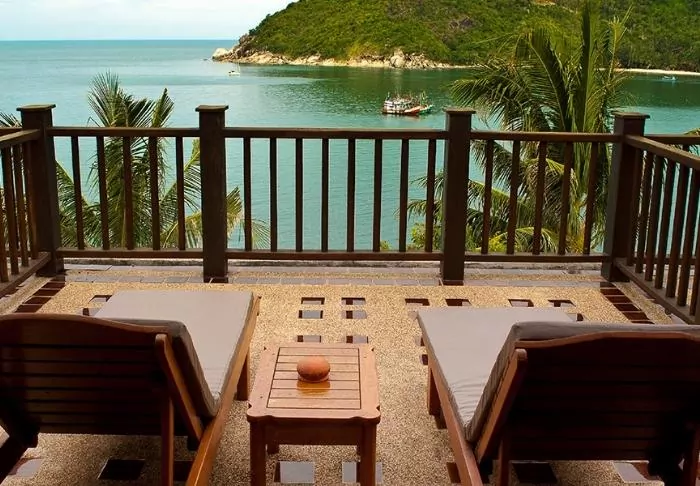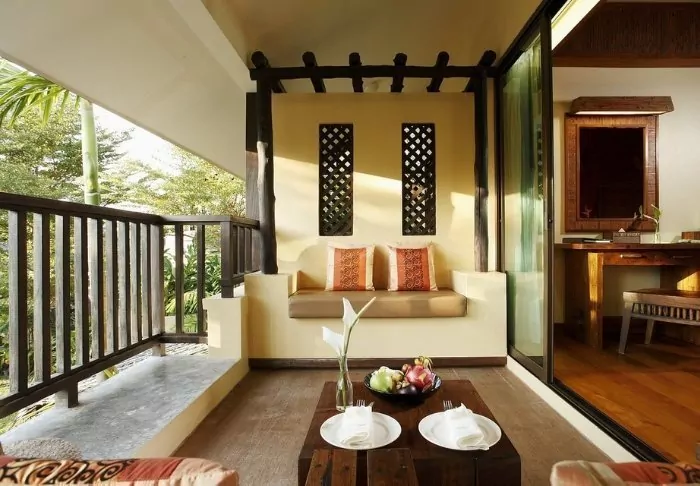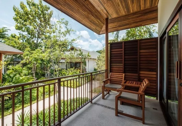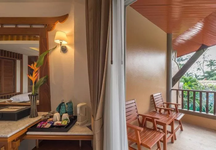 The rooms are also decorated in Thai style with beautiful wood carvings and lovely patterns on pillows and rugs. The rooms offer a TV, tea and coffee making facilities, air conditioning, a safe, a minibar, a hair dryer – and an umbrella in case of a tropical downpour. All rooms have a private balcony.
