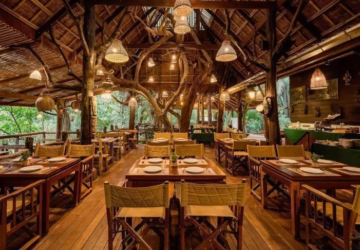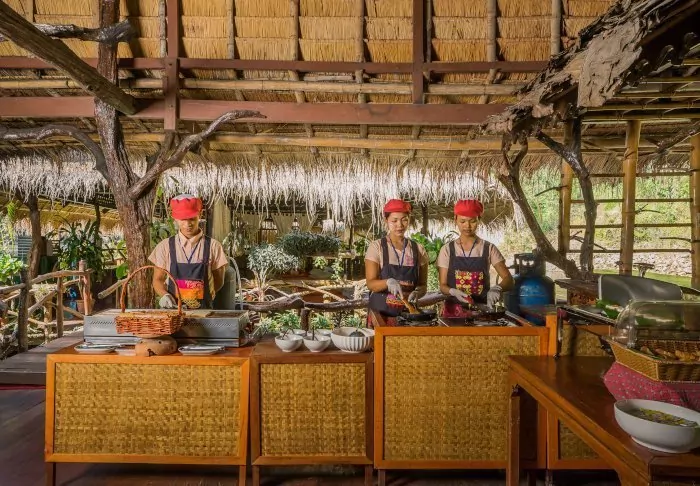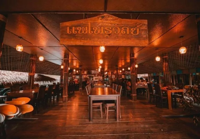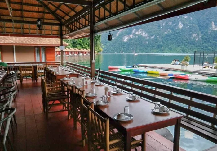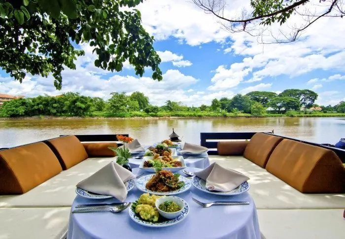 Meals are served as delicious Thai dishes in a cosy, open restaurant overlooking the river. When night descends, the place is lit by lanterns, creating a magical ambience.