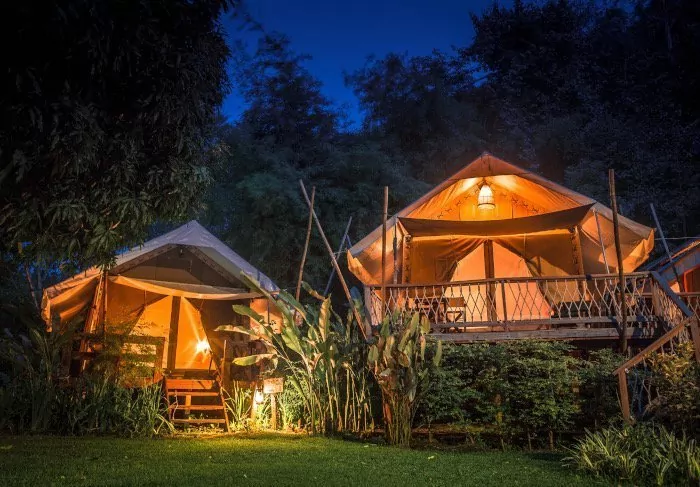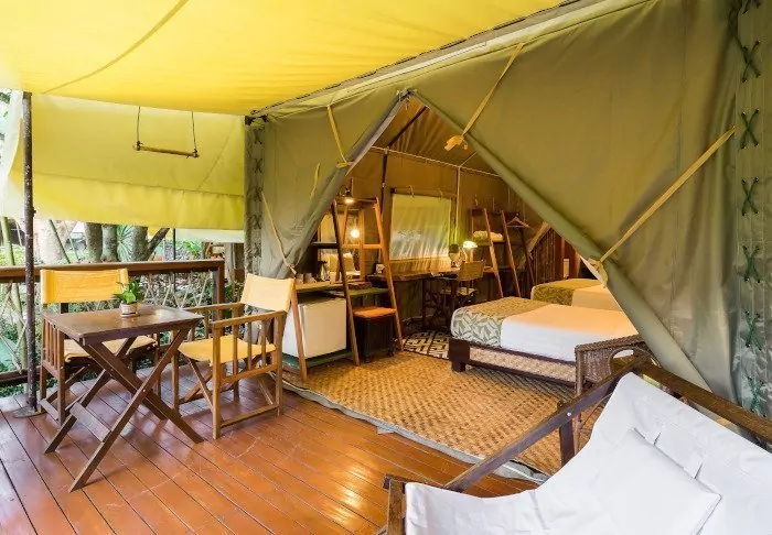 The camp consists of 38 luxurious canvas tents of between 26 and 32 m² which are raised half a metre above ground. All of them have proper beds, a private bathroom with hot water, a hair dryer and toiletries as well as a private veranda from which you can enjoy the silence and the lush surroundings. All tents also have Wi-Fi, air conditioning, a dressing table/desk, complimentary bottled mineral water, a fridge and an electric kettle for tea and coffee. After 10 pm, it’s quiet time at the camp – so no loud music, just the sounds of the jungle.