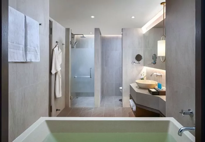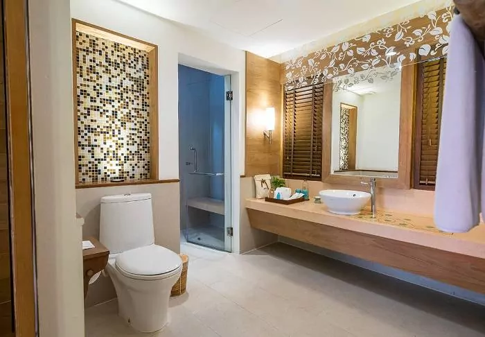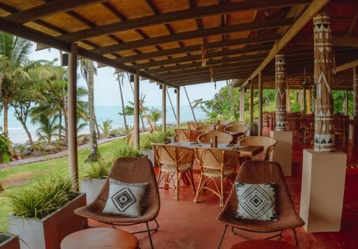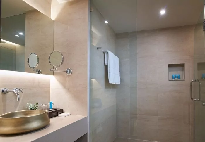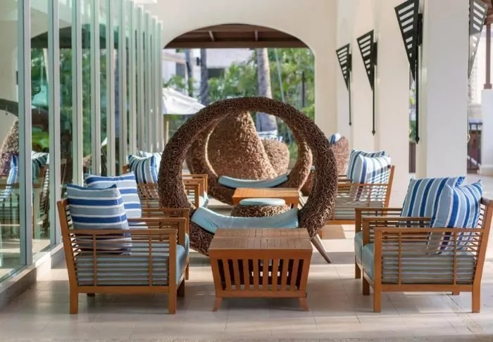 The hotel consists of several buildings set in lush surroundings, with immaculate gardens and tall palm trees swaying elegantly in the gentle breeze. The resort’s 116 rooms are crafted to provide you with a private and peaceful haven. Each room is bright, featuring a modern design that seamlessly blends with the natural world outside. From the furnished terrace, you can admire the verdant garden enveloping the resort while enjoying a relaxed morning coffee or a quiet moment. Every room is equipped with modern conveniences, including Wi-Fi, air conditioning, a safety box, a minibar, a coffee maker, and bottled mineral water. The bathroom is an experience in its own right, complete with both a bath and a rain shower, along with toiletries, a hairdryer, and a bathrobe.