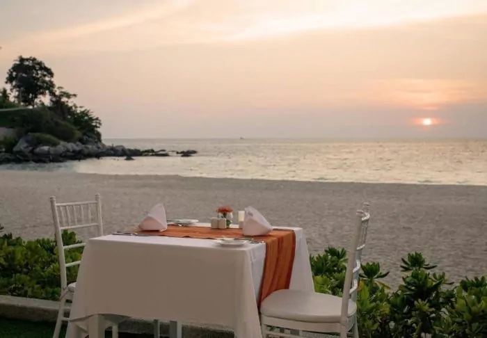 Earlier in the day, you might have had a wonderful, relaxing Thai massage in the town, perhaps while the children enjoyed themselves at the hotel’s “Kids’ Club”. You might have been on an excursion around Phuket and experienced a little of the local life – and hopefully also have had time for a swim in the turquoise-blue sea.