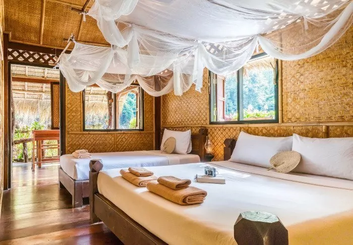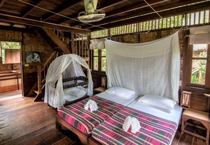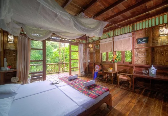 The flotel has two sections comprising a total of 100 bamboo huts. Rooms are simply furnished with comfortable beds and mosquito nets, as well as a hand-held fan, torch, vanity table, bottled mineral water, and life jacket. The rooms have no electricity, and consequently, there is no minibar or Wi-Fi. On your private veranda, you can relax in a hammock while enjoying the view of the calm river with towering bamboo along the banks and wild orchids in the trees. You can also take a refreshing dip straight from the veranda or paddle a canoe. Each room features its own bathroom with a toilet, toiletries, and a cold-water shower.